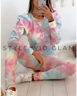 A classic “dollette” ensemble consisting of a white milkmaid-style top with puff sleeves and lace scalloped edging. The look is completed with high-waisted, candy-striped pink trousers. The fine vertical stripes and soft color palette create a clean, preppy, and ultra-feminine vibe.